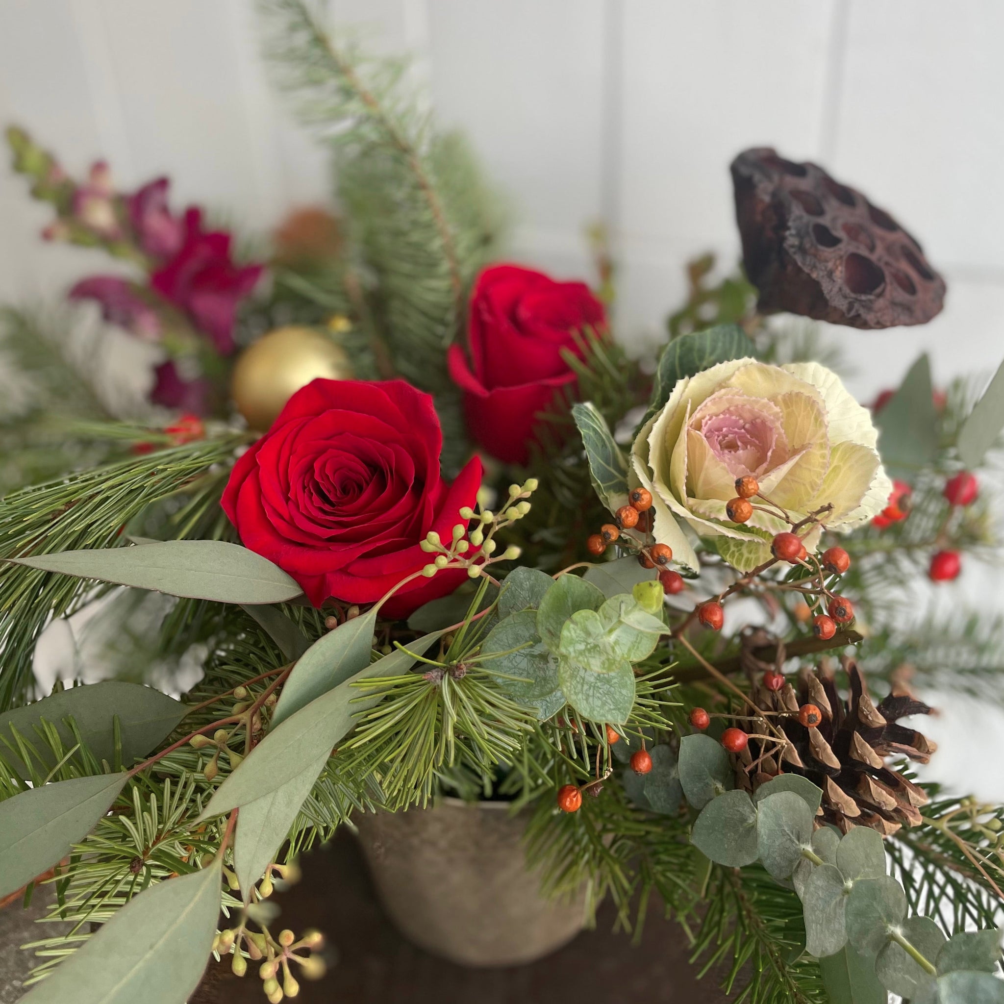 Our expert florists will curate a stunning centerpiece featuring local blooms thoughtfully arranged in a charming low-sitting vase, designed for a 360-degree viewing experience.